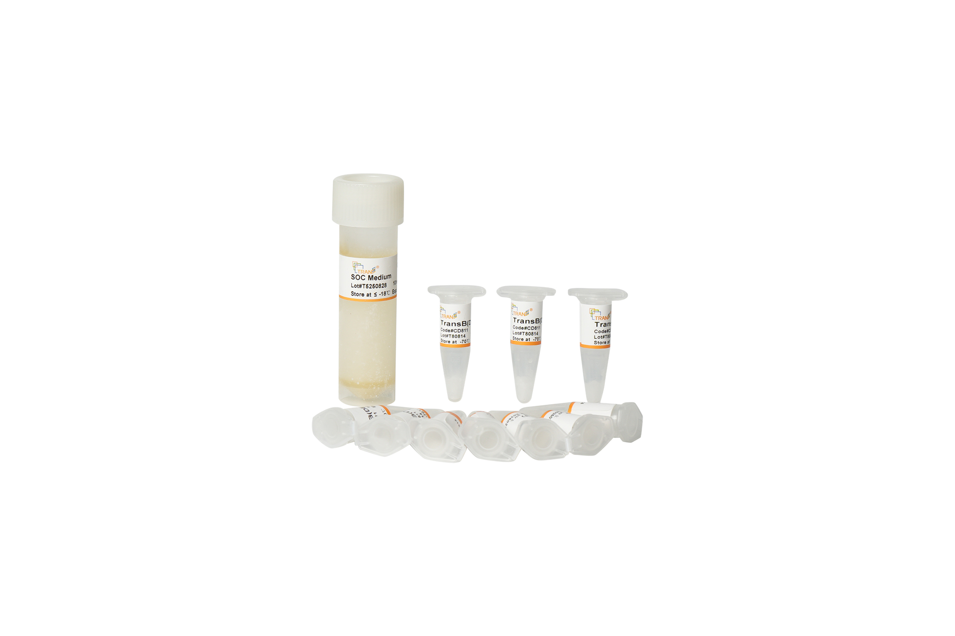 TransB(DE3) 化学感受态细胞经特殊工艺制作,可用于DNA 的化学转化。细胞具有卡那霉素(KanR) 和四环素(TetR) 抗性。使用pUC19 质粒DNA 检测,转化效率可达107 cfu/μg DNA。使用Control Plasmid I (Amp+) 用于检测细胞是否具有表达功能,表达蛋白大小为25 kDa。